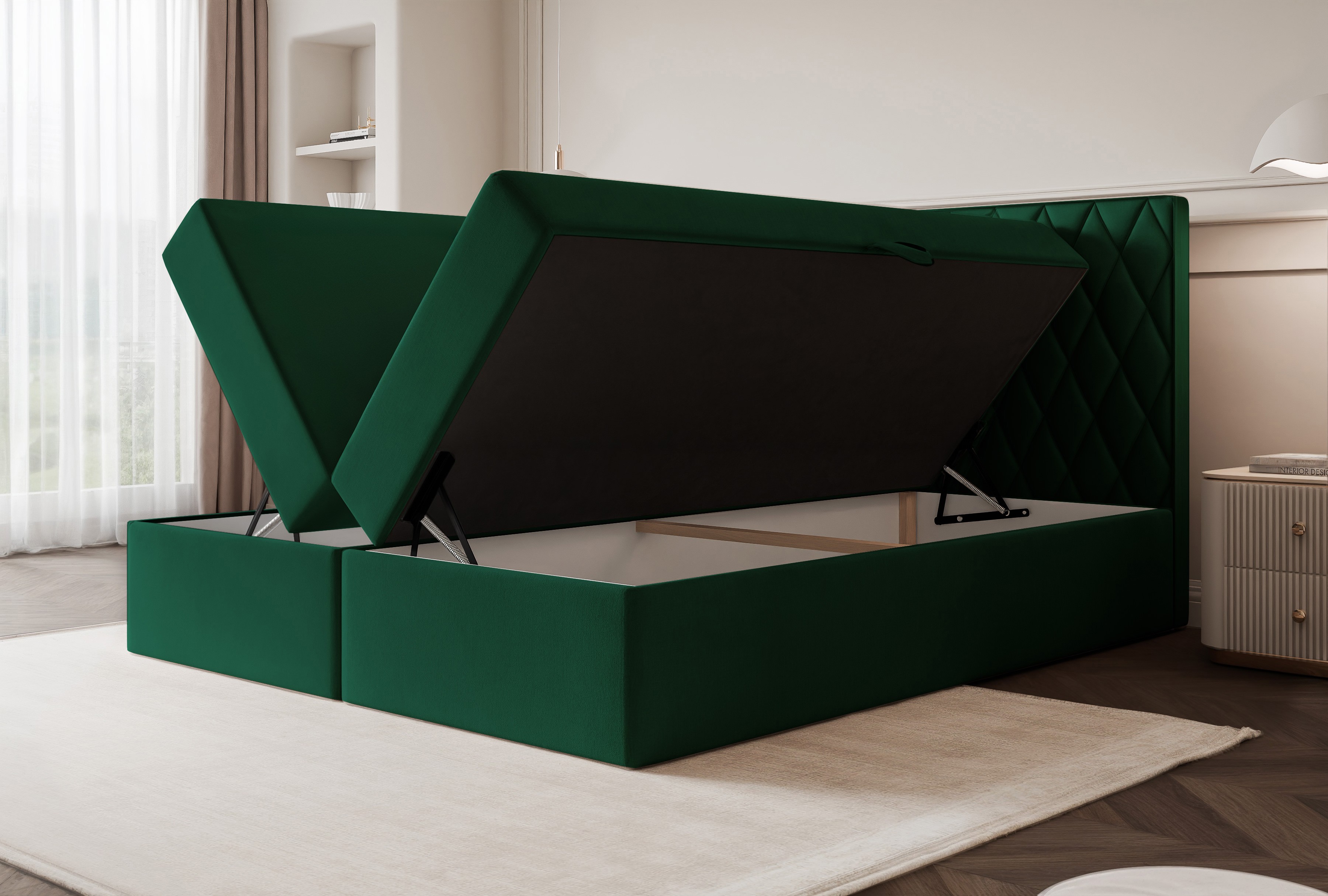Pojemnik na pościel: Otwierany na boki wraz z automatami wspomagającymi otwieranie.