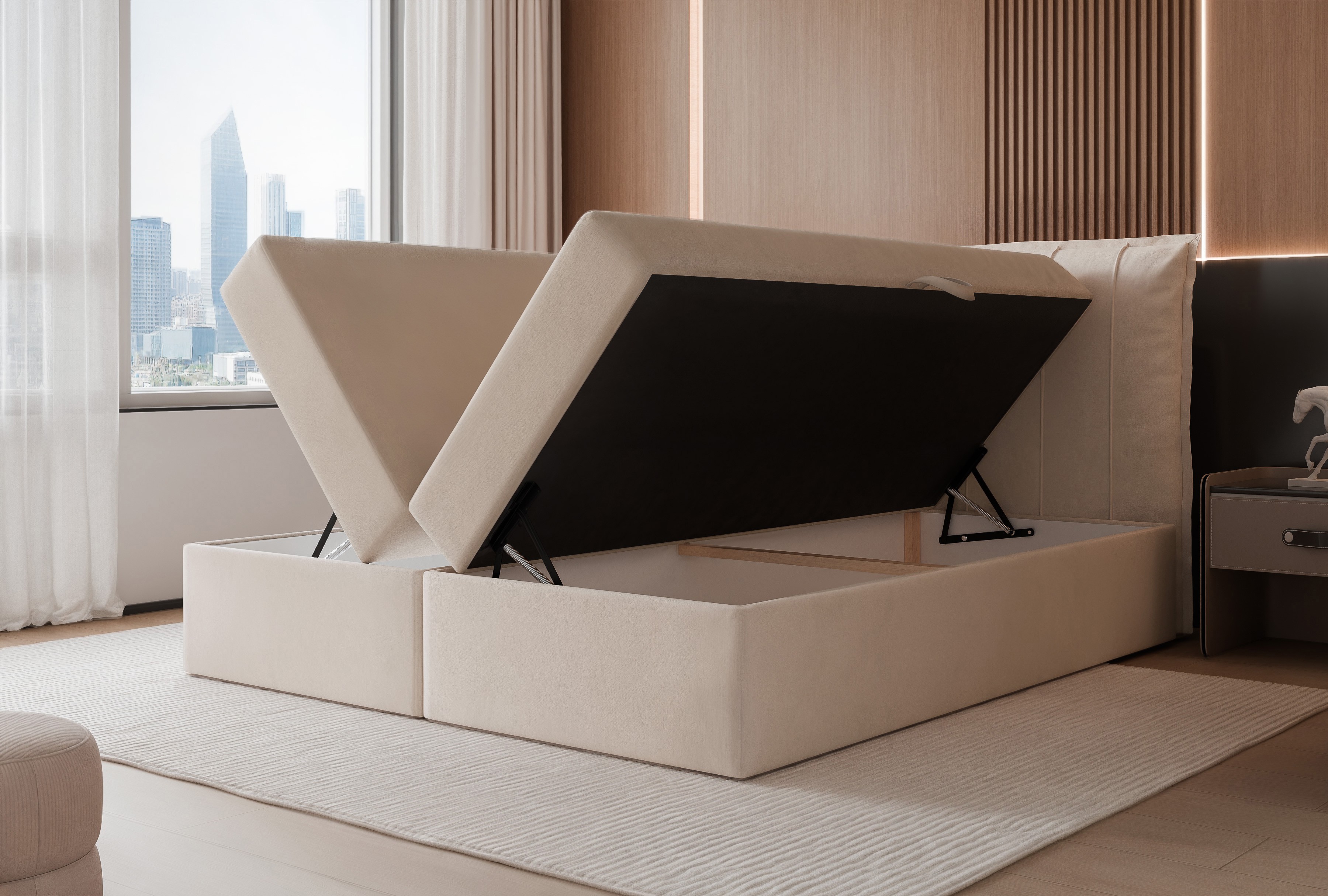 Pojemnik na pościel: Otwierany na boki wraz z automatami wspomagającymi otwieranie.