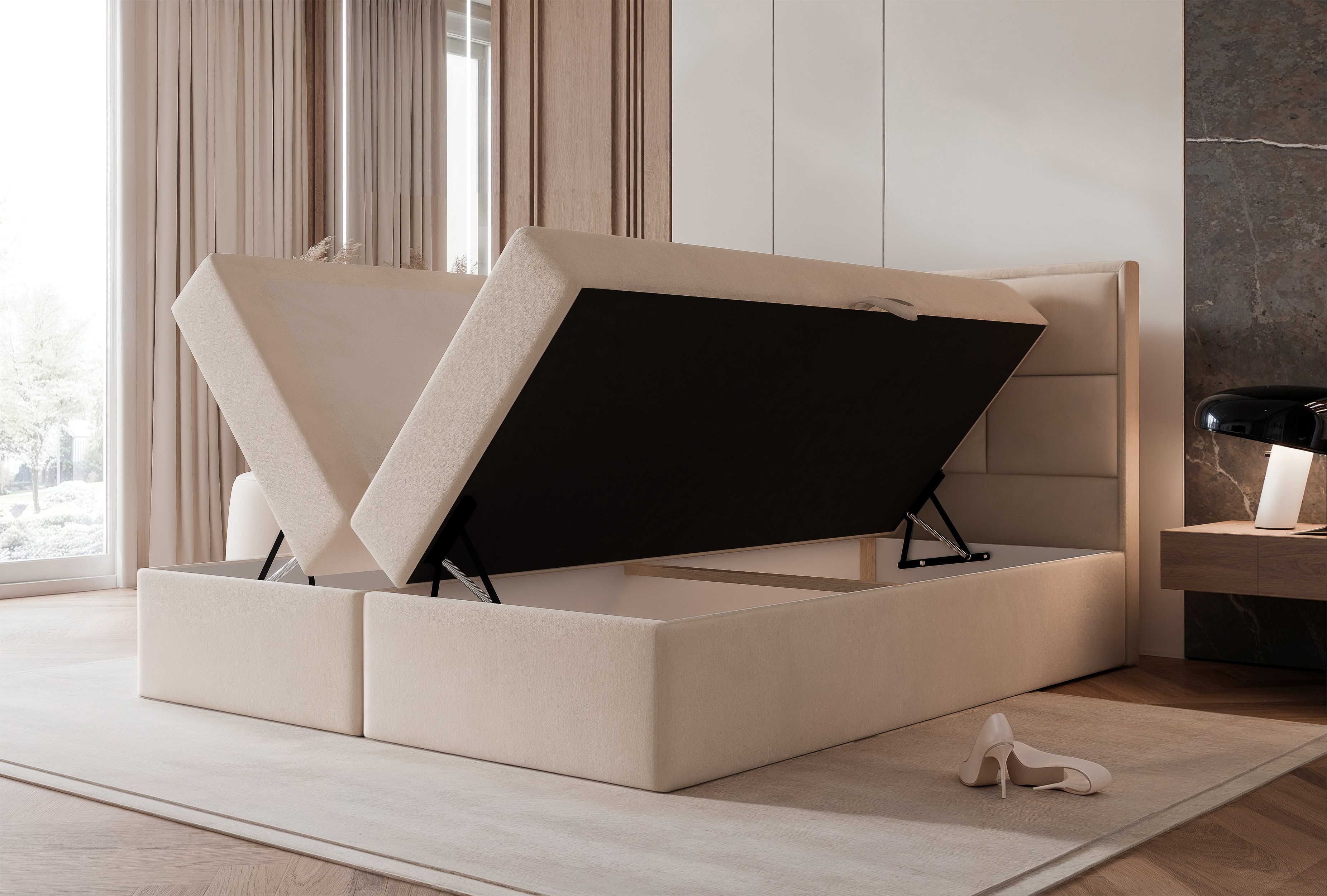 Pojemnik na pościel: Otwierany na boki wraz z automatami wspomagającymi otwieranie.