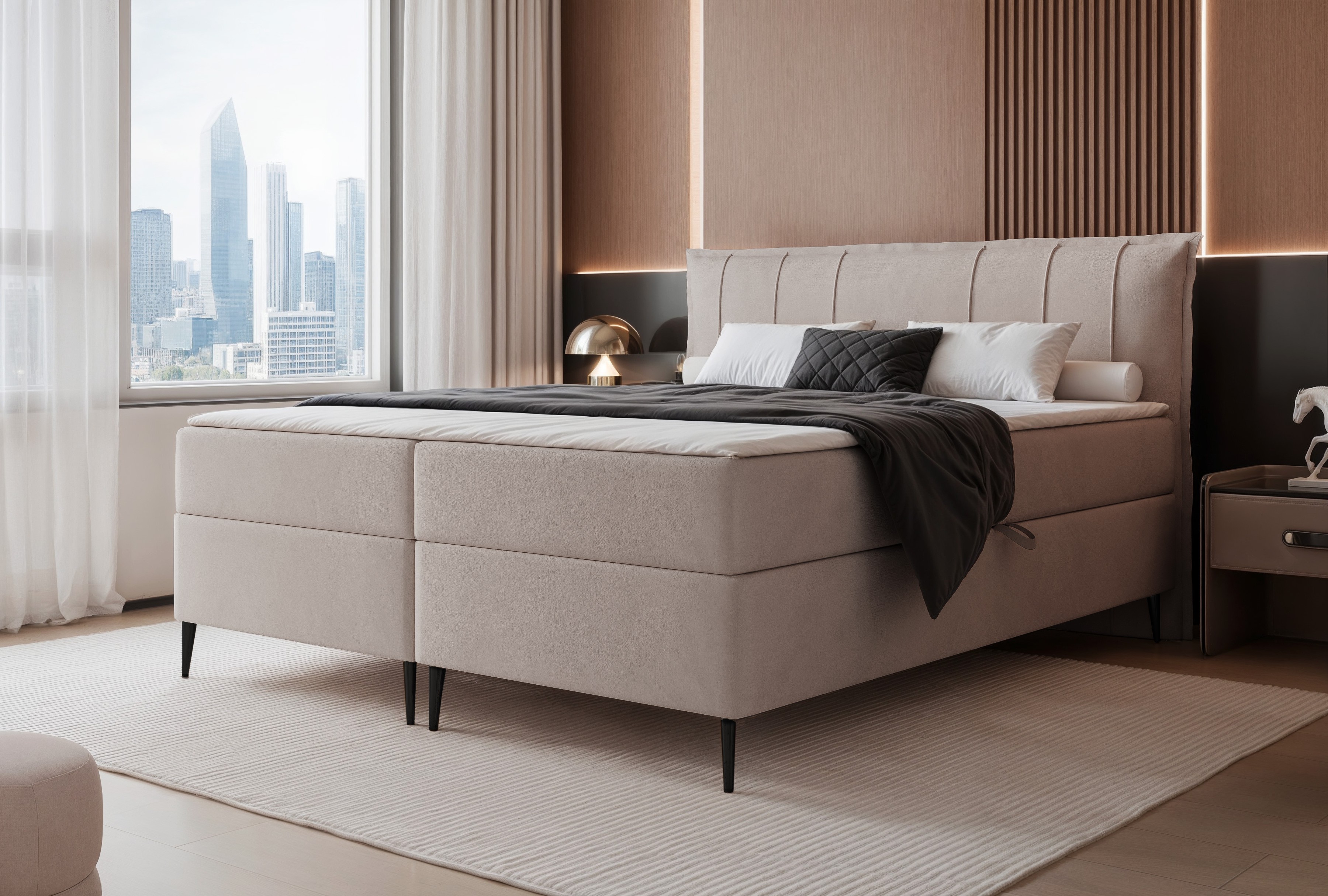Łóżko kontynentalne SUZI z pojemnikami na pościel to połączenie wygody, elegancji i praktycznych rozwiązań do każdej sypialni. Stabilna konstrukcja z dwoma pojemnikami na pościel zapewnia dodatkowe miejsce do przechowywania i pomaga utrzymać porządek.
