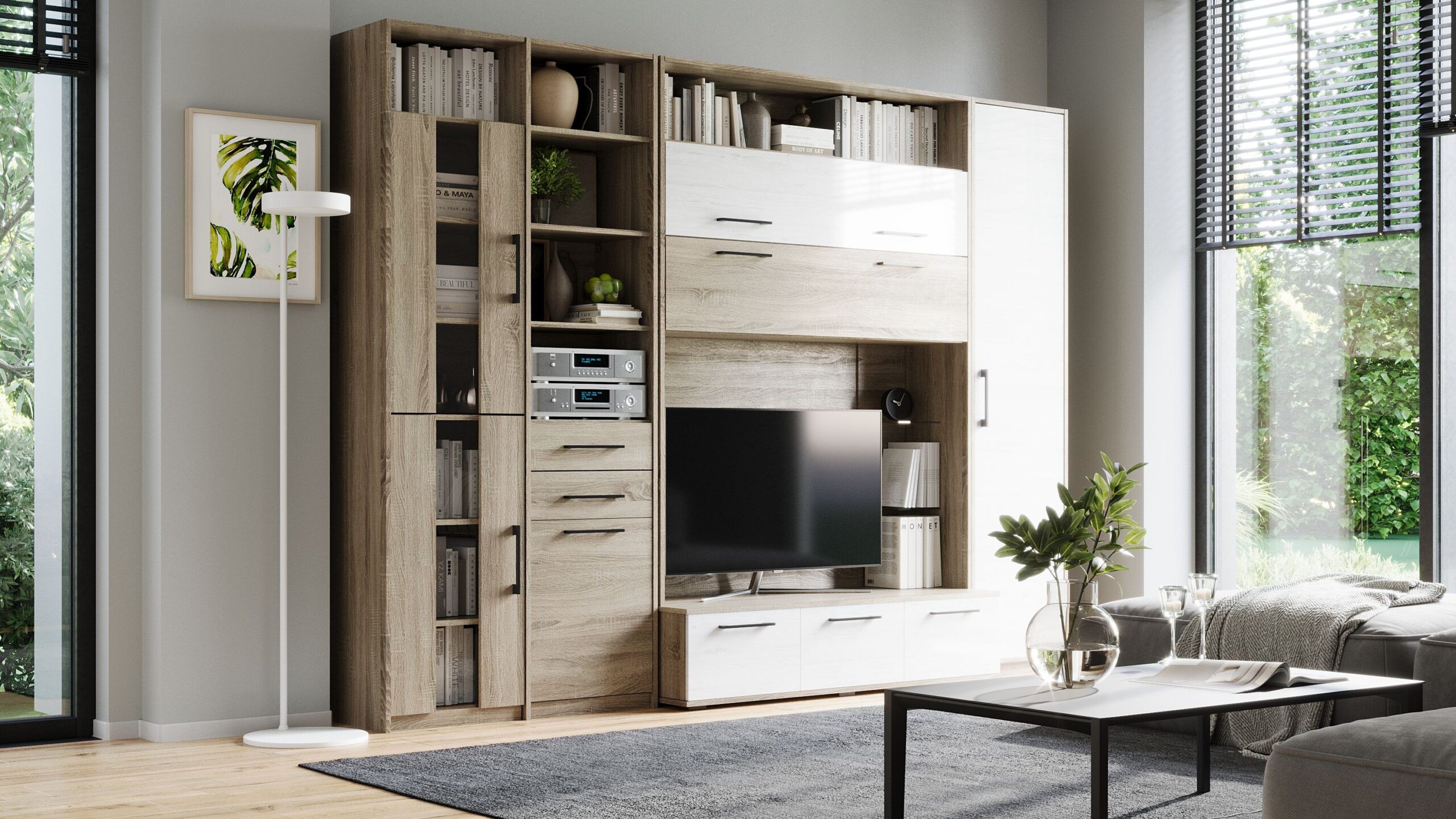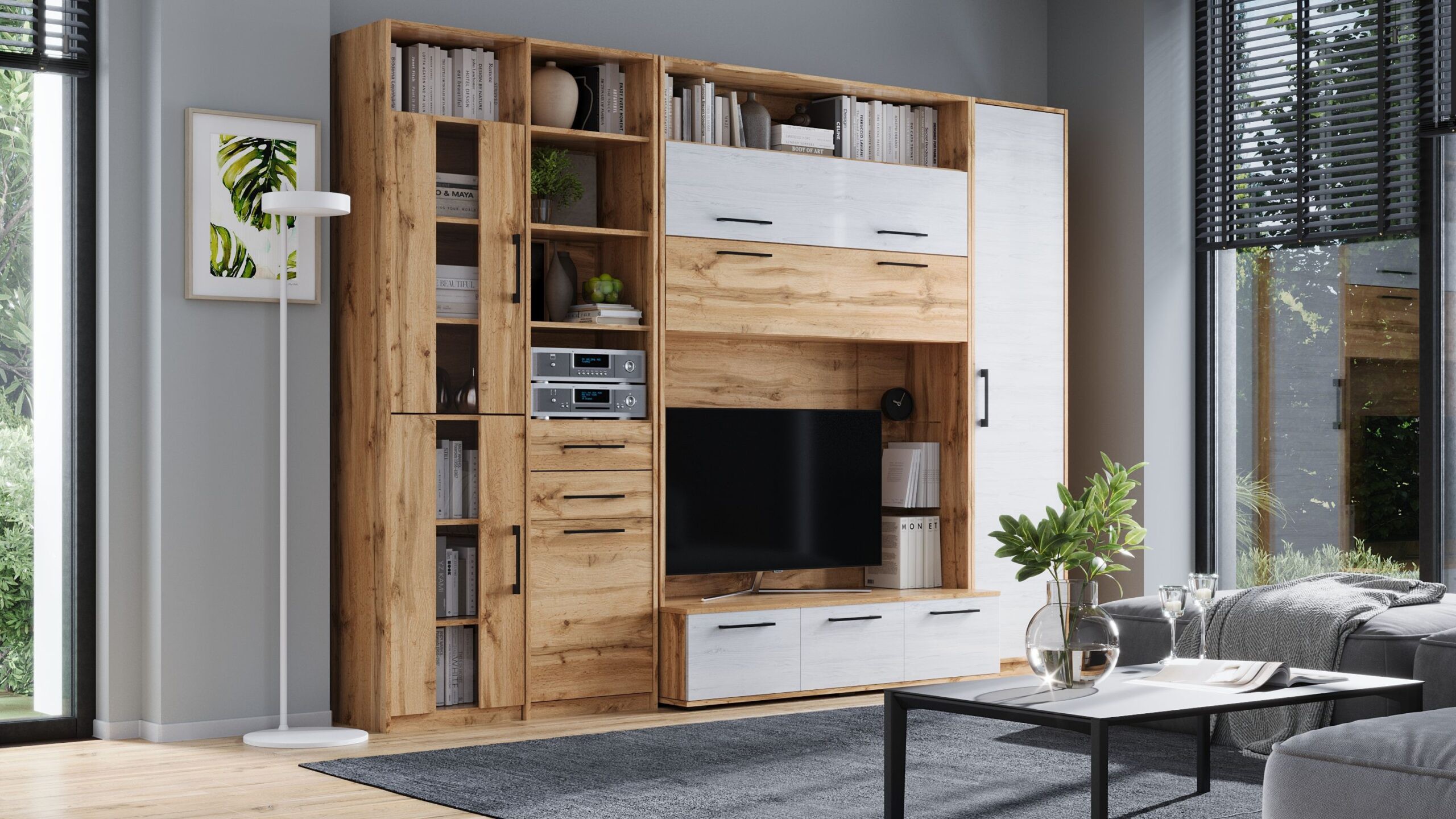 Zestaw FIGARO cechuje nowoczesny i elegancki design, solidność oraz funkcjonalność. Wykonane z wysokiej jakości płyty laminowanej pozwolą cieszyć się trwałością przez długie lata, a prostota wykonania daje wygodę użytkowania nawet najbardziej wymagającym. Dodatkowo korpusy zostały obklejone obrzeżami ABS. Meble sprawdzą się w pokojach dziennych oraz salonach. Meble są pojemne i dostępne w różnych kolorach.