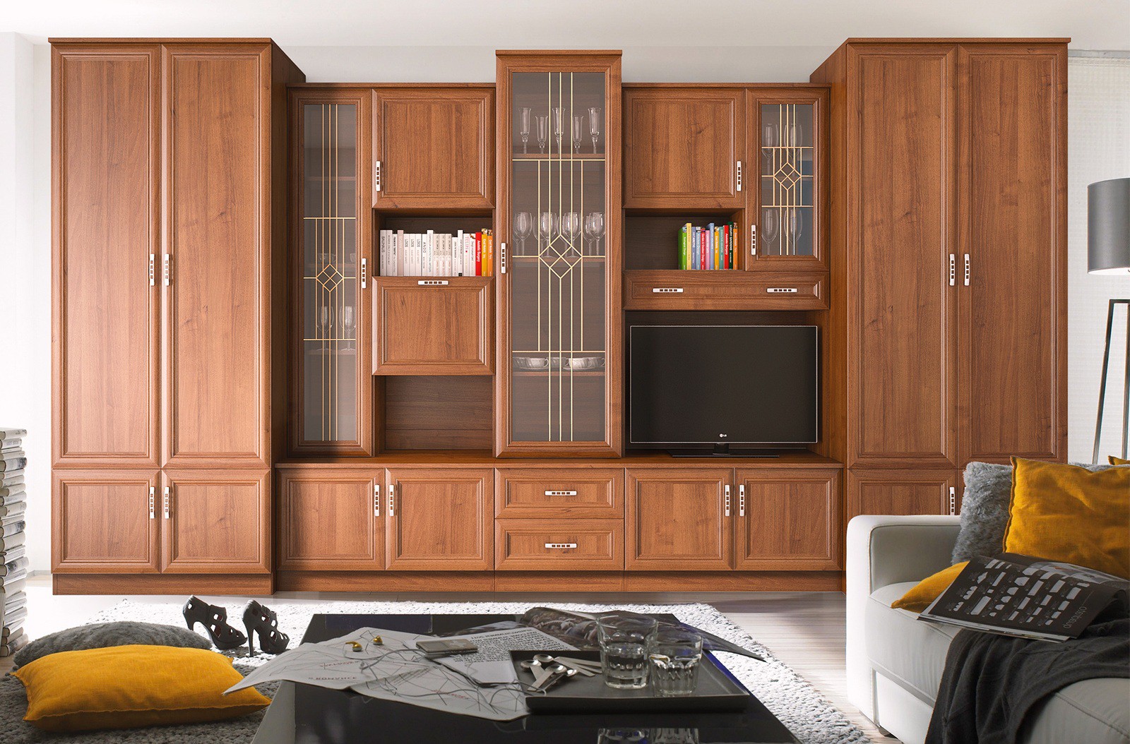 Zestaw MAGNAT to rozwiązanie dla osób ceniących pełne wykorzystanie powierzchni użytkowej w swoich wnętrzach. Wysokie szafy zapewniają wiele miejsca do przechowywania, a ich przeszklona część daje możliwość wyeksponowania szczególnie lubianych przedmiotów. Proste bryły czynią zestaw uniwersalnym i ponadczasowym.Meble są pojemne i dostępne w różnych kolorach.