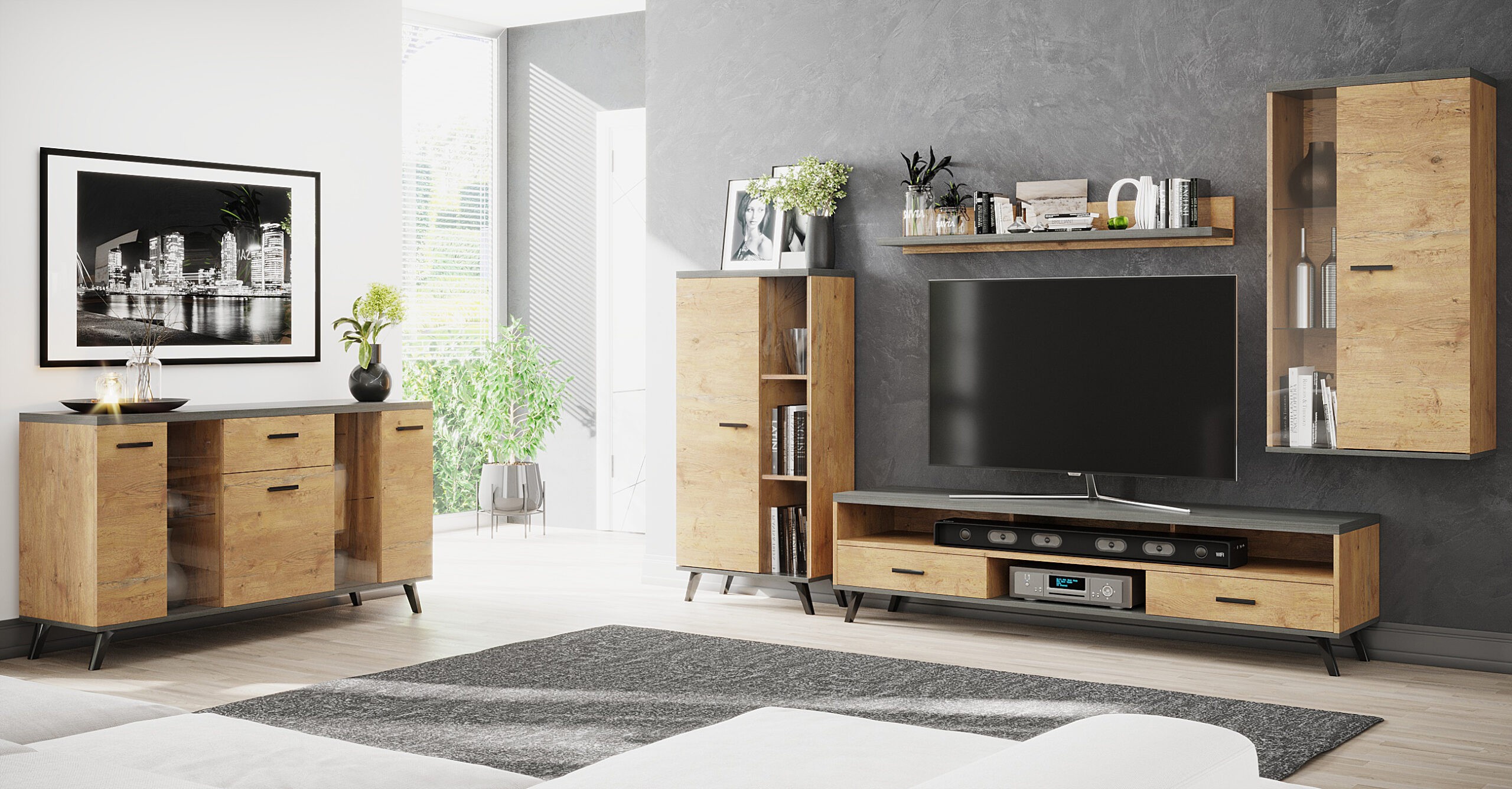 Zestaw Mebli DAR 2 to niewielki mebel, ale jakże potrzebny. Przyda się zarówno w małym, jak i w dużym salonie. Pełni funkcję praktyczną i estetyczną, bo może być piękną dekoracją we wnętrzu. Można również postawić na niej dowolnego rozmiaru telewizor. Natomiast wiszące szafki pomieszczą takie drobiazgi jak szklanki, figurki lub książki. Niewątpliwym atutem systemu są także czarne nóżki, ułatwiające sprzątanie pomieszczeń, oraz nadające bryłom lekkości.