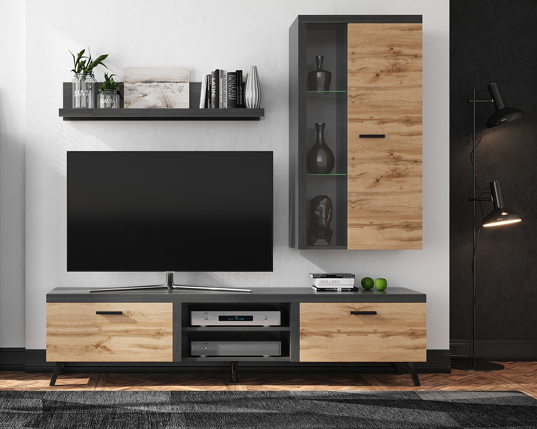 Zestaw Mebli NIK 1 to niewielki mebel, ale jakże potrzebny. Przyda się zarówno w małym, jak i w dużym salonie. Pełni funkcję praktyczną i estetyczną, bo może być piękną dekoracją we wnętrzu. Można również postawić na niej dowolnego rozmiaru telewizor. Natomiast wiszące szafki pomieszczą takie drobiazgi jak szklanki, figurki lub książki. Niewątpliwym atutem systemu są także czarne nóżki, ułatwiające sprzątanie pomieszczeń, oraz nadające bryłom lekkości.