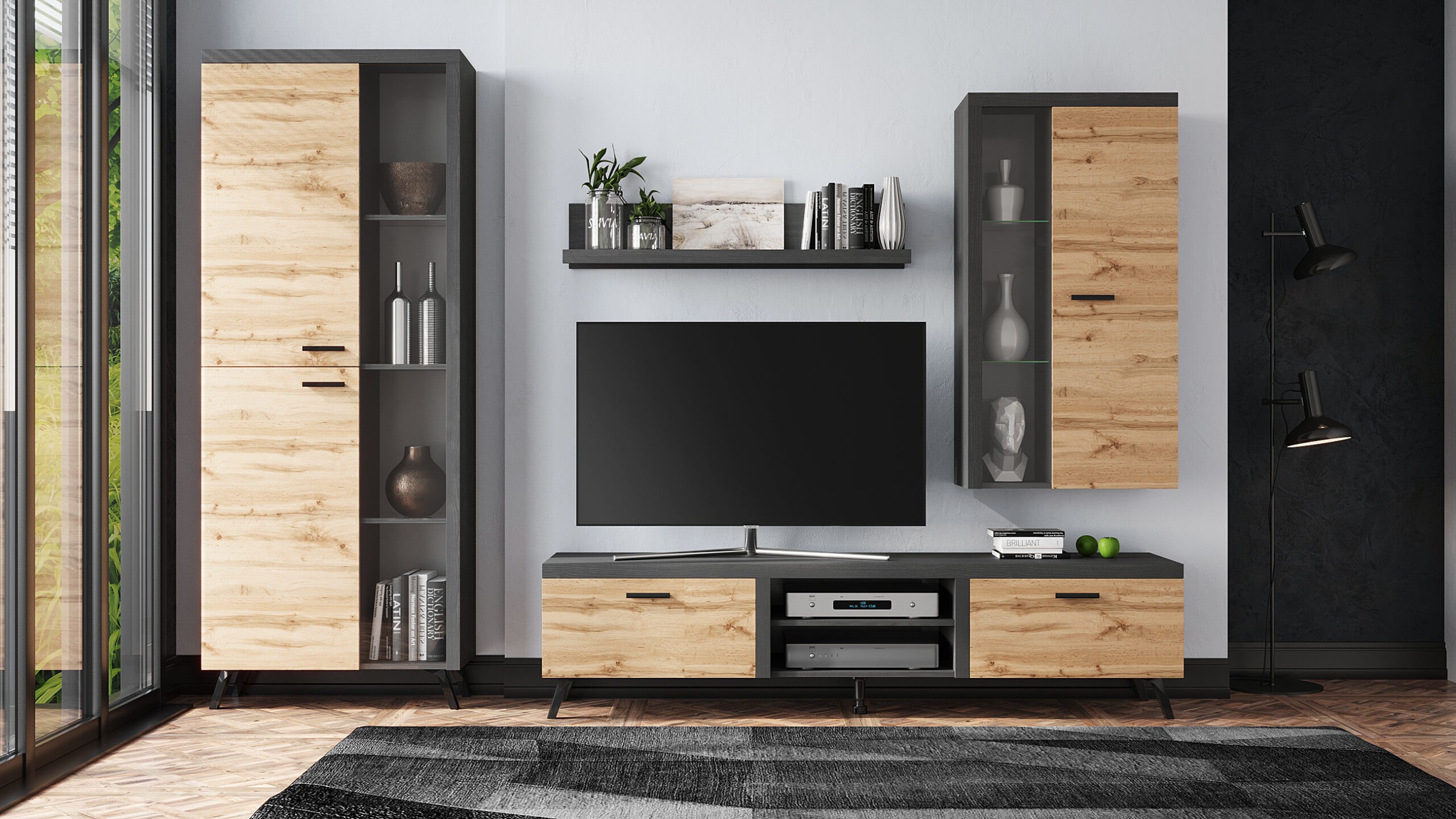 Zestaw Mebli NIK 3 to niewielki mebel, ale jakże potrzebny. Przyda się zarówno w małym, jak i w dużym salonie. Pełni funkcję praktyczną i estetyczną, bo może być piękną dekoracją we wnętrzu. Można również postawić na niej dowolnego rozmiaru telewizor. Natomiast wiszące szafki pomieszczą takie drobiazgi jak szklanki, figurki lub książki. Niewątpliwym atutem systemu są także czarne nóżki, ułatwiające sprzątanie pomieszczeń, oraz nadające bryłom lekkości.