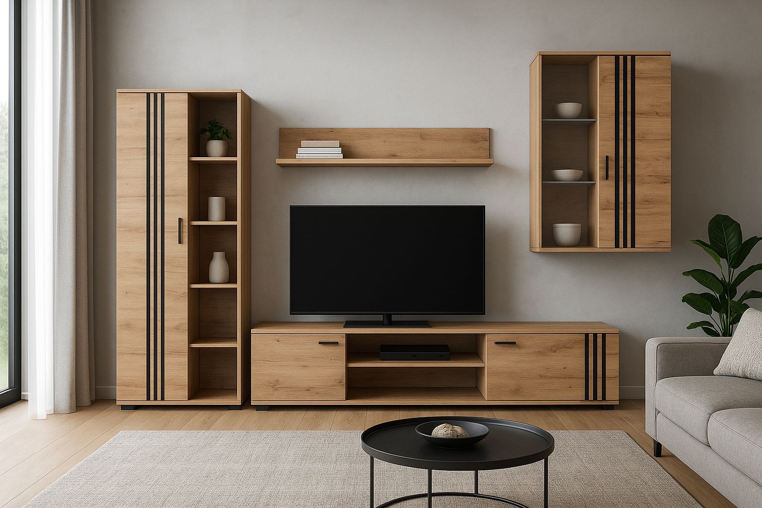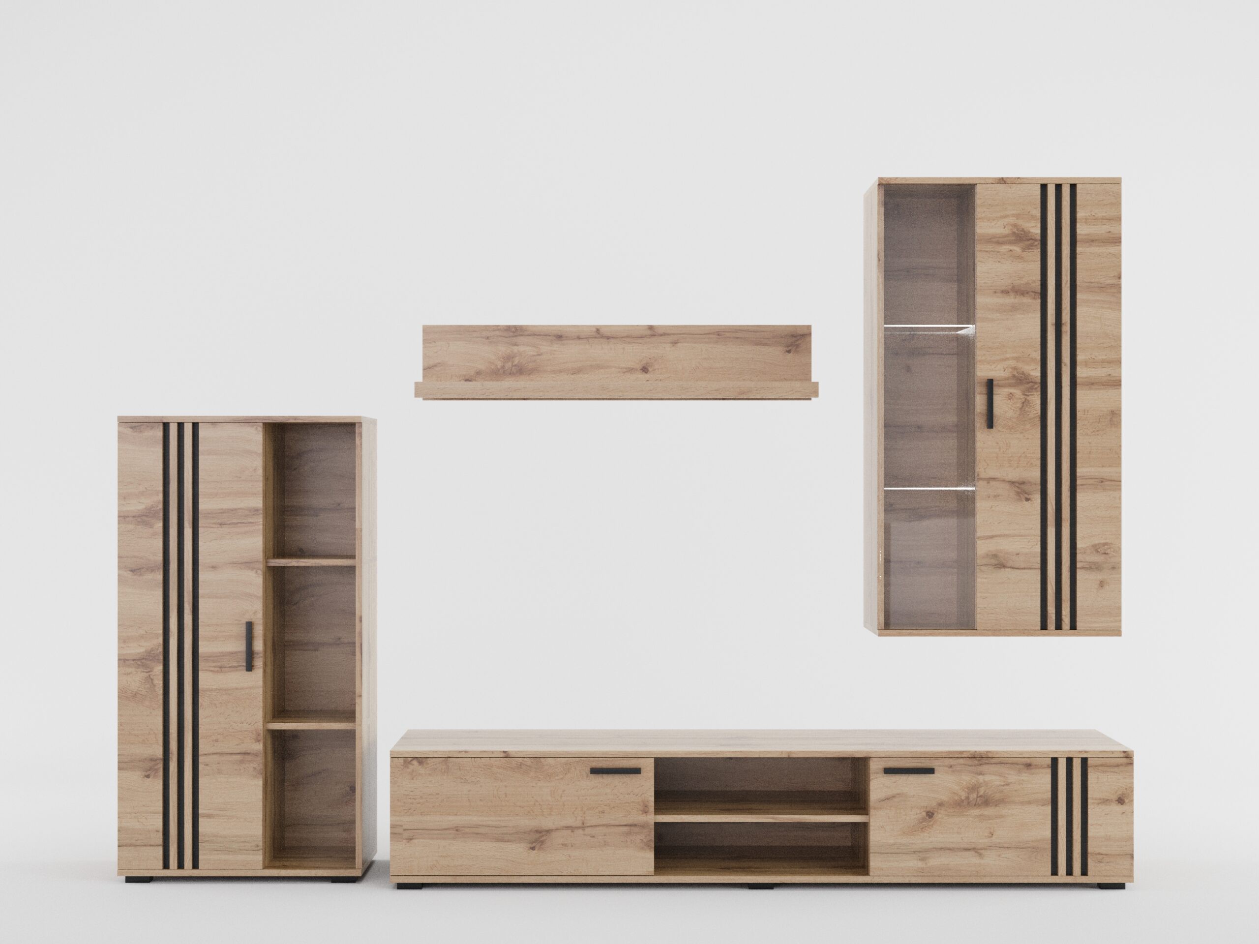 Zestaw Mebli MASS B to niewielki mebel, ale jakże potrzebny. Przyda się zarówno w małym, jak i w dużym salonie. Pełni funkcję praktyczną i estetyczną, bo może być piękną dekoracją we wnętrzu. Można również postawić na niej dowolnego rozmiaru telewizor. Natomiast wiszące szafki pomieszczą takie drobiazgi jak szklanki, figurki lub książki. Niewątpliwym atutem systemu są także czarne nóżki, ułatwiające sprzątanie pomieszczeń, oraz nadające bryłom lekkości.