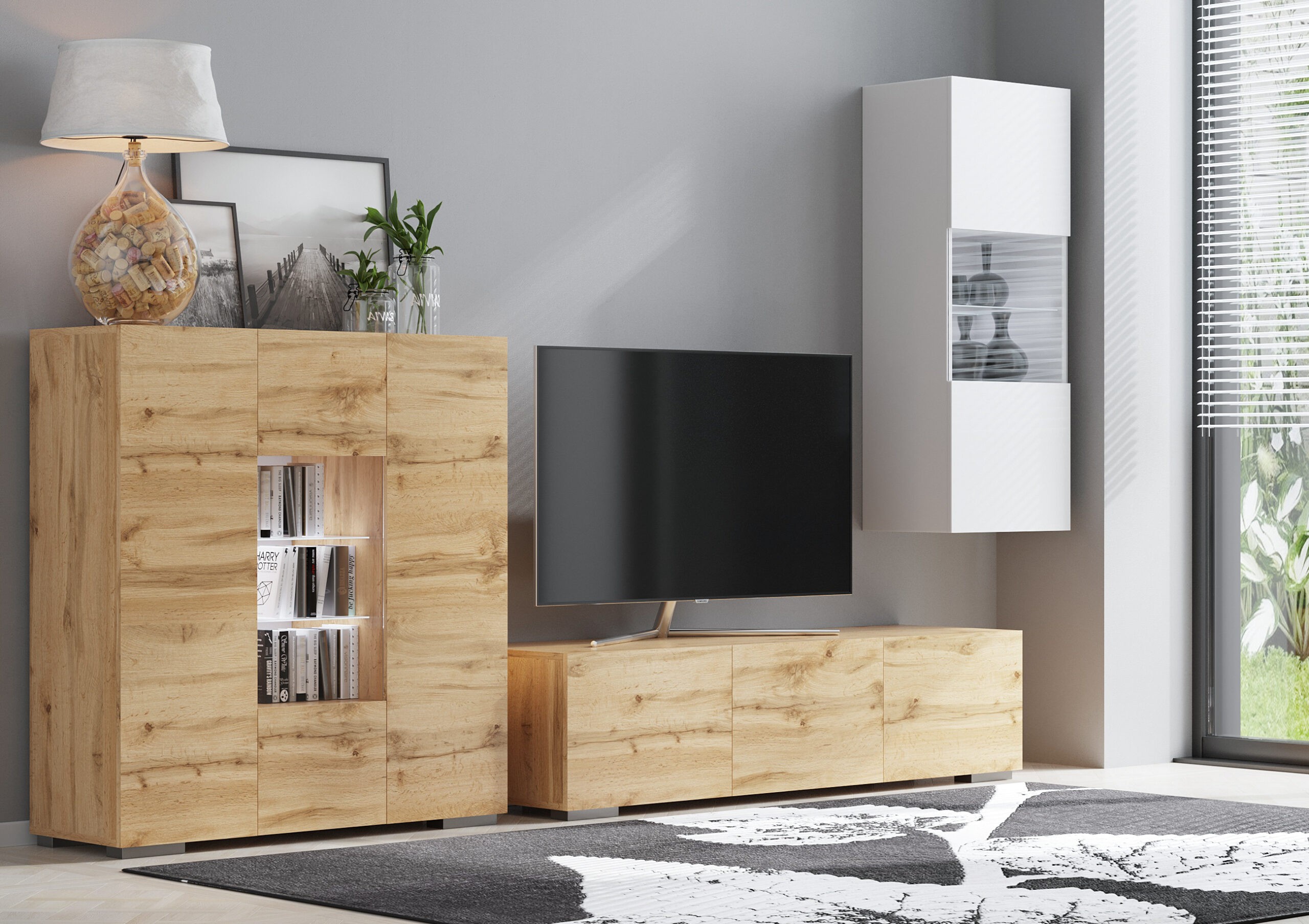 Zestaw Mebli ELTON to niewielki mebel, ale jakże potrzebny. Przyda się zarówno w małym, jak i w dużym salonie. Pełni funkcję praktyczną i estetyczną, bo może być piękną dekoracją we wnętrzu. Można również postawić na niej dowolnego rozmiaru telewizor. Natomiast wiszące szafki pomieszczą takie drobiazgi jak szklanki, figurki lub książki. Niewątpliwym atutem systemu są także czarne nóżki, ułatwiające sprzątanie pomieszczeń, oraz nadające bryłom lekkości.