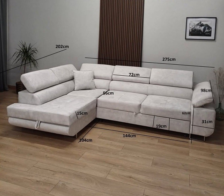Narożnik MONTE BIS to połączenie nowoczesnego designu, wysokiego komfortu i praktycznych rozwiązań, idealne do przestronnego salonu. Dzięki wymiarom 275 × 202 cm zapewnia dużą powierzchnię do siedzenia, a wbudowana funkcja spania umożliwia szybkie przekształcenie narożnika w wygodne łóżko o powierzchni 130 × 193 cm.