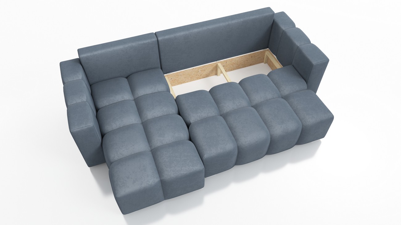 Narożnik pokojowy ma wzmocnioną konstrukcję z drewna sosnowego, co jest jego wielkim atutem. Korpus, siedzisko, oparcie oraz tył mebla są tapicerowane. Duży pojemnik na pościel zapewnia mnóstwo miejsca do przechowywania różnych rzeczy.