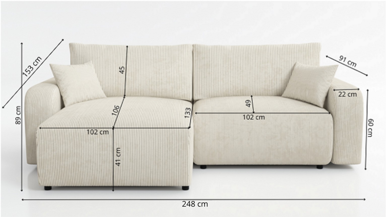 Funkcjonalny narożnik rozkładany o powierzchni spania 133x204 cm. Długość powierzchni spania z pewnością zadowoli wysokie osoby.